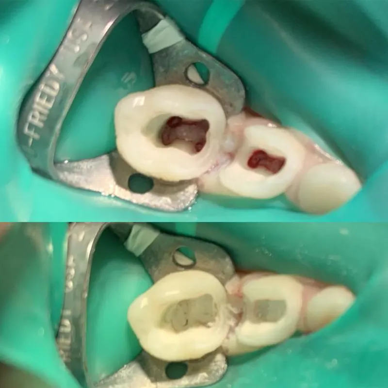 La ventaja es que en un diente que presenta dolor no tenemos que realizar la exodoncia, no tenemos que quitarlo, podemos quitar su nervio y rellenarlo con un material o colocar una corona preformada de acero o de zirconio.e